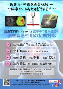 2024年度の研修医向けのミニレクチャーの第2回目として「脳梗塞旧世紀の初期対応」をテーマに2内科脳循環代謝研究室(腎・高血圧・脳血管内科)医員の池内泰仁先生にお話をしていただきます。
