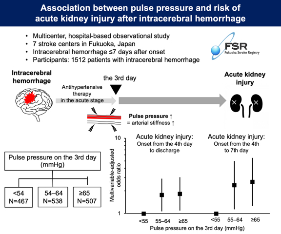 - 脈圧は動脈硬化の指標であり、ICH後のAKI発症リスクと独立して関連していました。